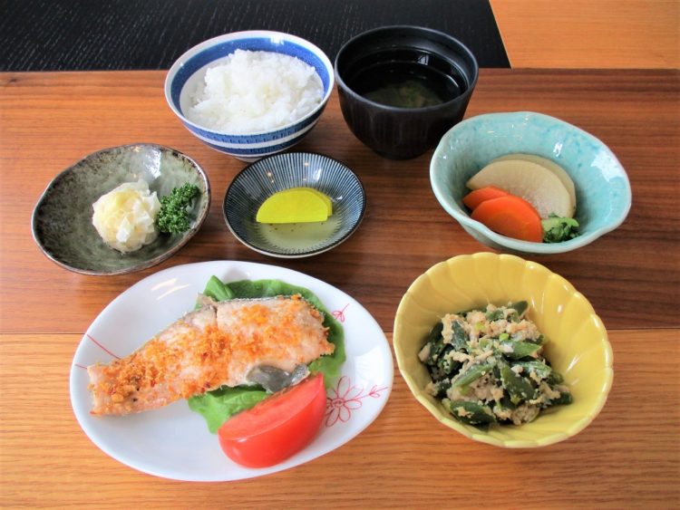 ご飯、椎茸のすまし汁、鮭のパン粉焼き、大根の煮物、京風しゅうまい、いんげんの和え物、