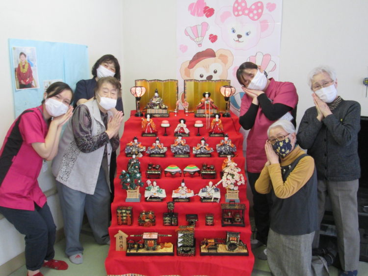 デイサービスのお雛様の前でお客様と職員で記念撮影📸