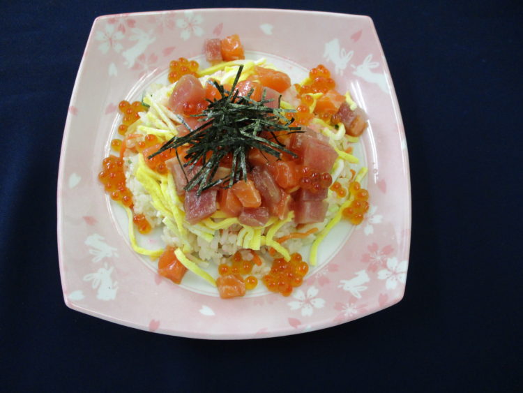ちらし寿司、さもだしと大根のみそ汁、ブロッコリーとソーセージのソテー、五目ひじき煮、もやしとニラのたらこ和え、なす漬、ラブレ