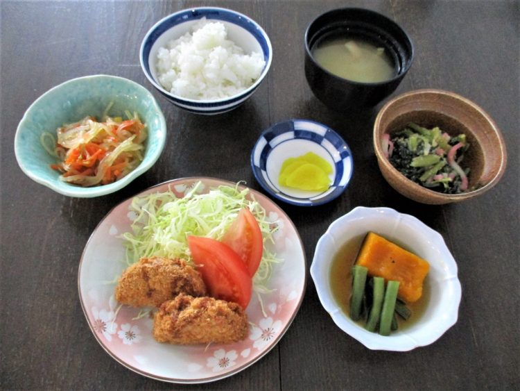 ご飯、板麩のみそ汁、チーズ入りメンチカツ、南瓜の煮物、春雨のソテー、小松菜のごま和え、