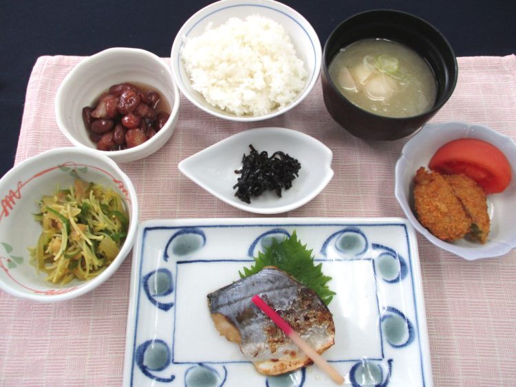ご飯、里芋とねぎのみそ汁、さわらの生姜漬焼き、ビーフンのカレー炒め、