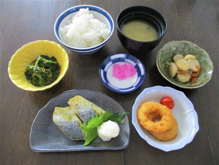 ご飯、ぶなぴーのみそ汁、さわら西京焼き、イカドーナツ、里芋の炒め物、ほうれん草お浸し、