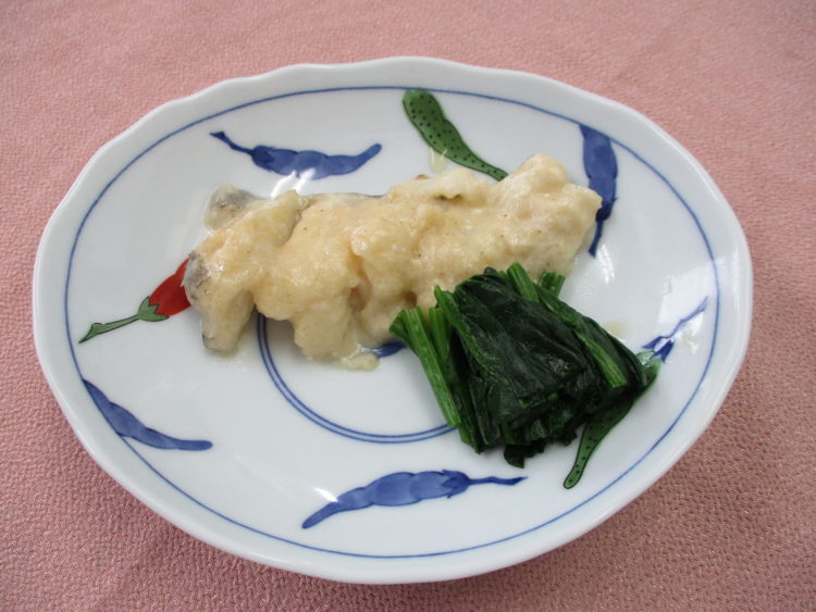 ご飯、花麩と三つ葉の清汁、たらの味噌マヨネーズ焼き、春雨ともやしの炒め物、枝豆のふっくら揚げ、キャベツ漬、フルーツ杏仁豆腐