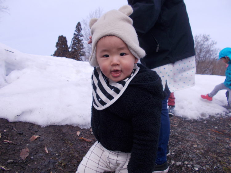 今日はとても天気が良かったのでお散歩に行ってきました。ほっぺに当たる風はまだ冷たいけれど、太陽の陽射しがとても暖かくとってもウキウキしてきます。子ども達は元気いっぱいにてくてく歩きます。まだまだ雪は残っている季節、山積みになった雪を発見するといてもたってもいられません。