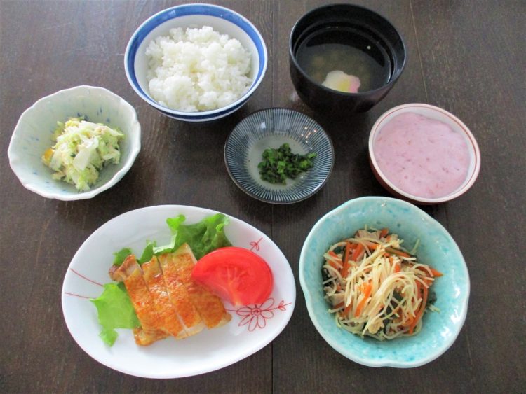 ご飯、オクラのスープ、タンドリーチキン、ビーフンのソテー、ツナサラダ、しその実漬け、