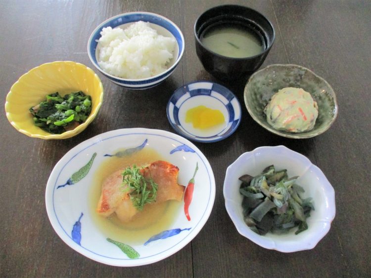 ご飯、里芋のみそ汁、赤魚のみぞれ煮、なすの中華風ソテー、ぜんまい白和え、菜の花のお浸し、