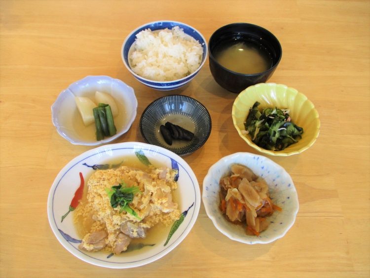 ご飯、白菜のみそ汁、親子煮、きんぴらごぼう、かぶの煮物、きゅうりの酢の物、なす漬け