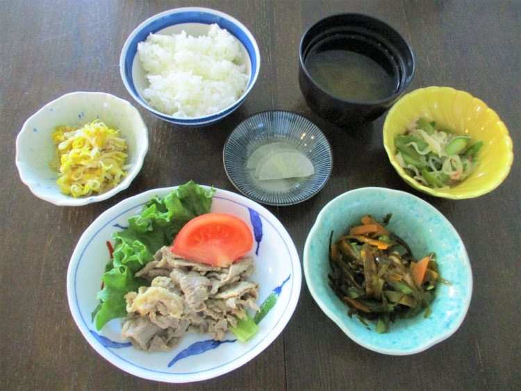 ご飯、コンソメスープ、牛肉の味噌漬け焼き、昆布と大豆の炒め煮、もやしのしらす和え、