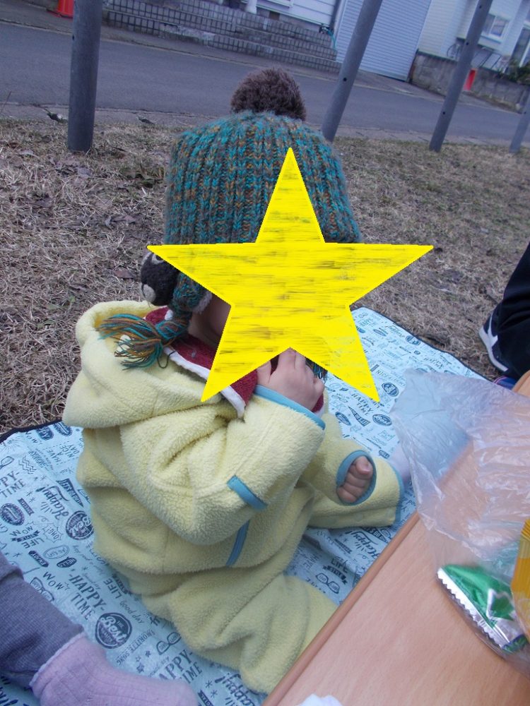 交通ルールを守り仲良く手を繋いで道路を歩きます。そして、近くの公園まで来ましたが、まだまだ雪があり遊具では遊べません。でも、歩いた後のおやつは格別でとてもいい笑顔を見せてくれました。