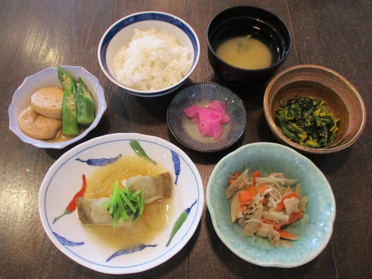 ご飯、わらびのみそ汁、かれいのおろし煮、オクラの炊き合わせ、ごぼうのみそ炒め、