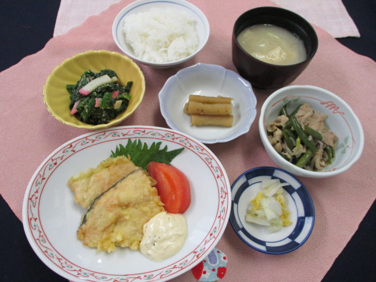 ご飯、大根と油揚げのみそ汁、ますの天ぷら、いんげんと豚肉の炒め物、ほうれん草のごま和え、たたきごぼう、白菜漬