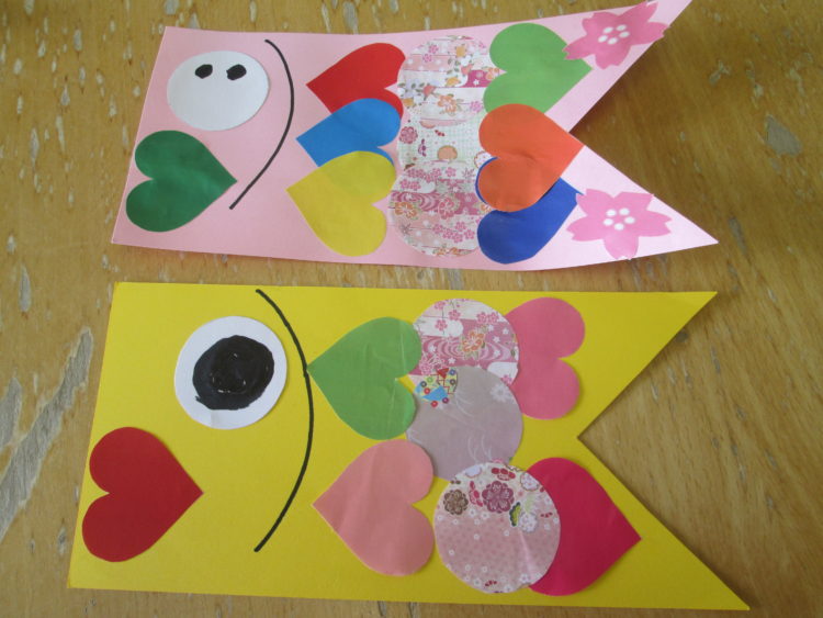 画用紙をこいのぼりの形に切り、いろんな形の折り紙を好きなように