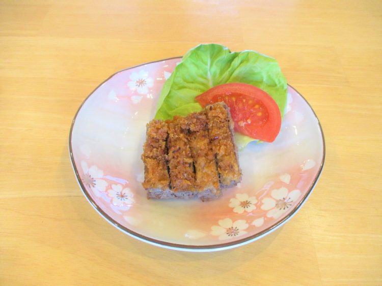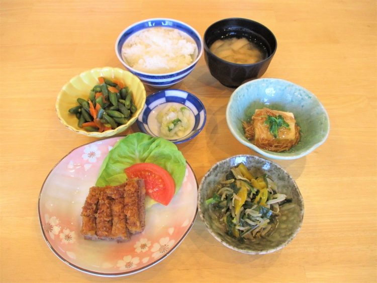 ご飯、玉葱のみそ汁、牛肉のパン粉焼き、ニラ炒め、豆腐のなめ茸がけ、いんげんの和え物、