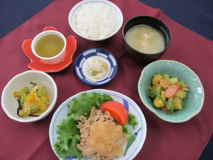 ご飯、ふきと油揚げのみそ汁、豚肉のおろしポン酢がけ、カリフラワーのカレー炒め、