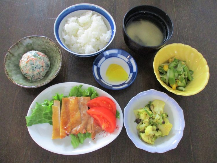 ご飯、さもだしのみそ汁、鶏肉の生姜はちみつ焼き、カリフラワーカレー炒め、春菊の白和え、