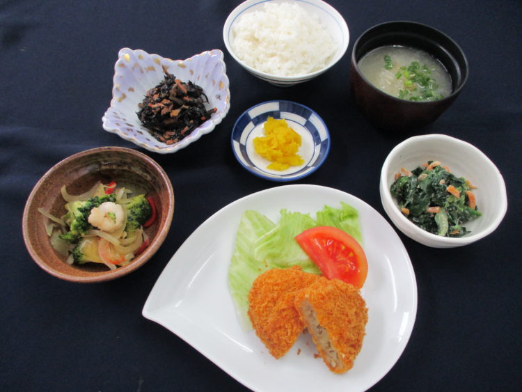ご飯、もやしと万能ねぎのみそ汁、牛肉コロッケ、ブロッコリーとえびの中華炒め、五目ひじき煮、ほうれん草と人参のくるみ和え、つぼ漬