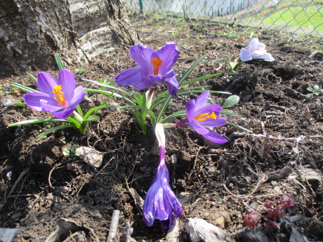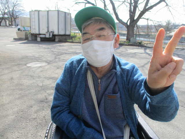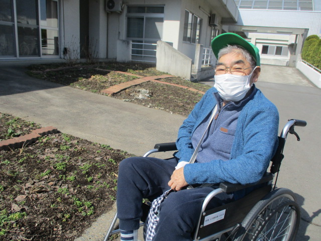 まだ花壇にはお花が咲いておりませんでしたが、桜の木の下に綺麗な紫色の花が咲いていました。お花をみて、なんぼ良い花だぁととても笑顔で観賞されておりました。