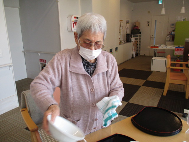 昼食後にK様に食器拭きをお願いしますと声がけしたところ「いいよ」と話された為、お願いをしました。