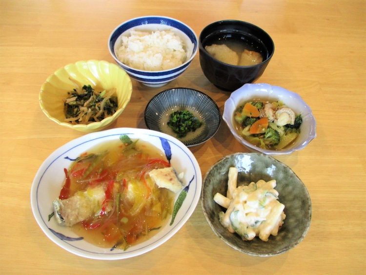 ご飯、棒麩のみそ汁、白身魚の野菜あんかけ、ブロッコリーと帆立のスープ煮、小松菜のソテー、