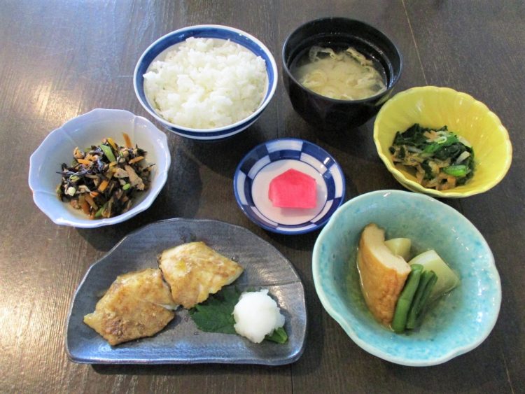 ご飯、舞茸のみそ汁、めばるの山椒焼き、かぶの煮物、ひじきの炒め物、ほうれん草の和え物、