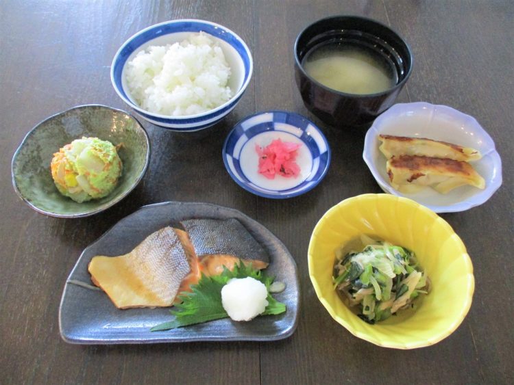 ご飯、さもだしのみそ汁、鮭の幽庵焼き、青梗菜と舞茸のソテー、焼き餃子、ずんだ和え、梅吹雪