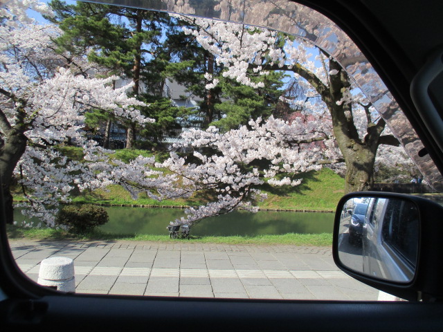 最初に五重塔の桜を見た後、その後弘前公園の周りを車内から桜を見ました。