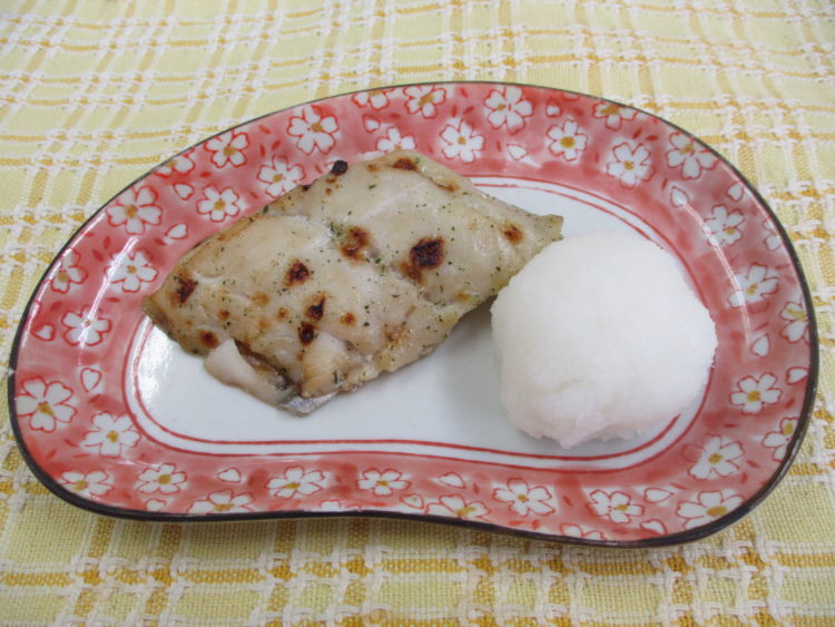 ご飯、竹輪と三つ葉のみそ汁、さわらの木の芽焼き、ほうれん草ときのこのソテー、焼き餃子、カリフラワーのスープ煮、きゅうり漬
