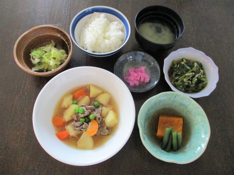 ご飯、わかめのみそ汁、肉じゃが、春菊の煮浸し、南瓜の煮物、キャベツとイカの酢味噌和え、