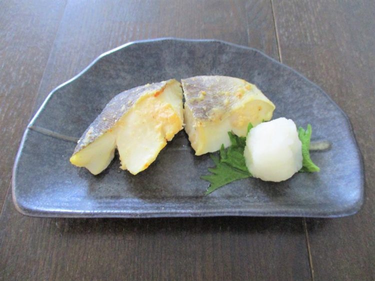 ご飯、えのきの味噌汁、たらのごま味噌焼き、なすの煮物、ブロッコリーのそぼろあんかけ、