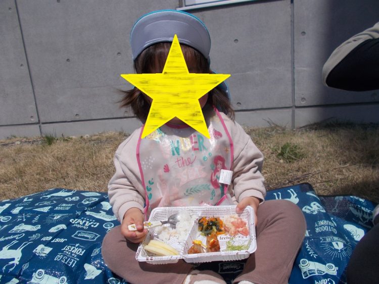 今日の給食は、パックに詰めて敷地内の裏庭にピクニックに行ってきました。