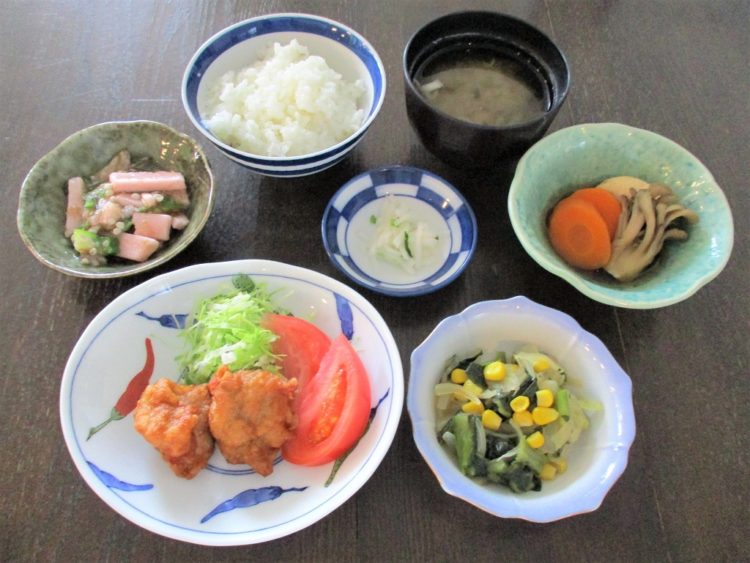 ご飯、なすのみそ汁、鶏肉の唐揚げ、小松菜の炒め煮、がんもの煮物、長芋の梅和え、白かぶ漬け