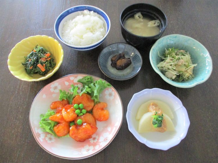 ご飯、細竹のみそ汁、えびのチリソース、ビーフンソテー、大根の田楽、ほうれん草のくるみ和え、