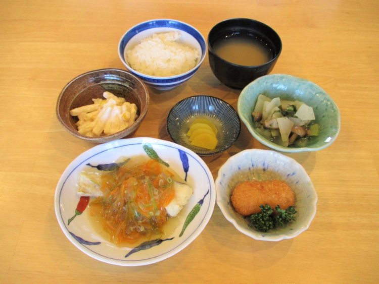 ご飯、あさりのみそ汁、たらの野菜あんかけ、かにクリームコロッケ、かぶのポトフ風、