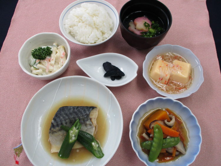 ご飯、花麩とあさつきの清汁、さばの味噌煮、南瓜の含め煮、マカロニサラダ、卵豆腐のかにあんかけ、なす漬