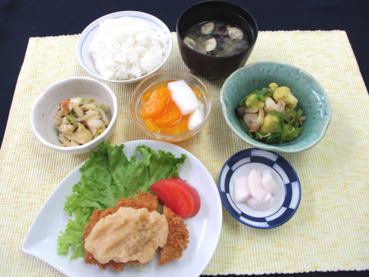 ご飯、なすといんげんのみそ汁、とんかつおろしポン酢、カリフラワーとえびのカレー炒め、