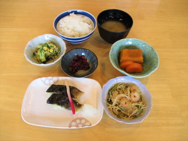 ご飯、さもだしの味噌汁、ホッケの塩焼き、南瓜の煮物、ビーフンとえびのソテー、