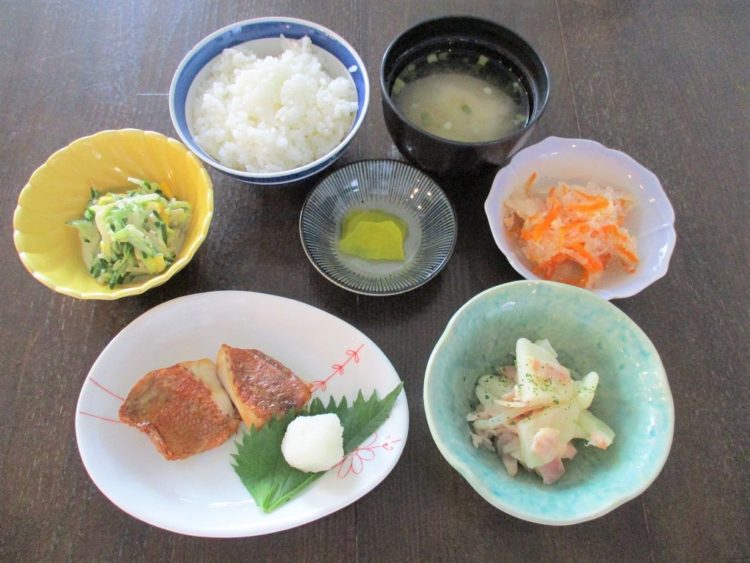 ご飯、ぶなぴーのみそ汁、赤魚の照り焼き、ジャーマンポテト、胡瓜のわさびマヨ和え、