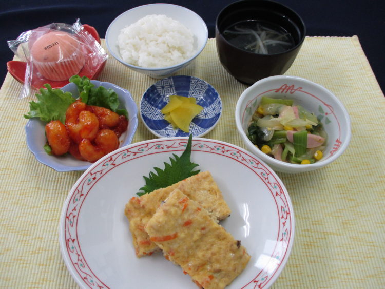 ご飯、わかめともやしのスープ、鶏ひき肉のぎせい豆腐、チンゲン菜とソーセージのソテー、えびチリ、かつおたくあん漬、いちご蒸しケーキ