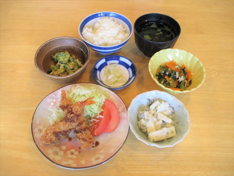 ご飯、椎茸のすまし汁、えびフライ、小松菜の味噌そぼろ炒め、ブロッコリーのサラダ、