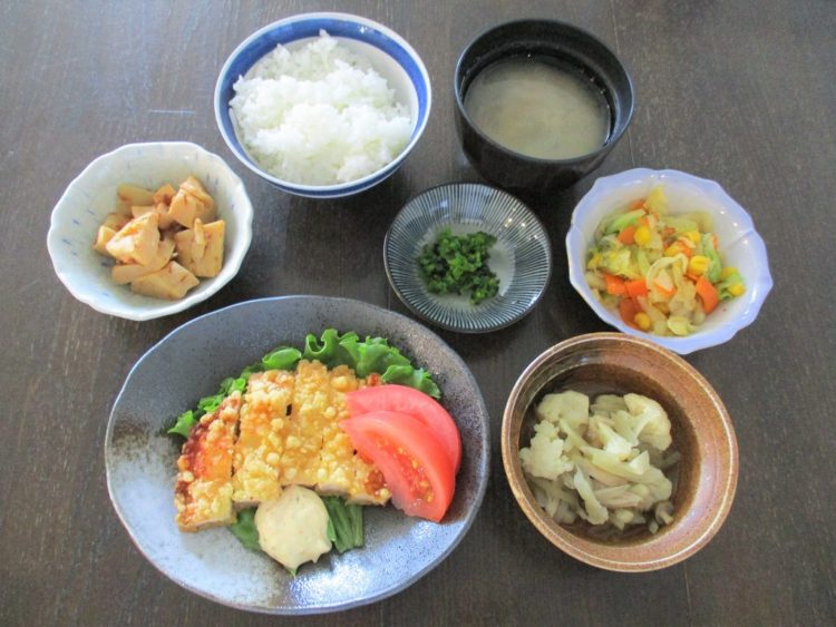 ご飯、さもだしのみそ汁、チキン南蛮、カリフラワースープ煮、たけのこの土佐煮、