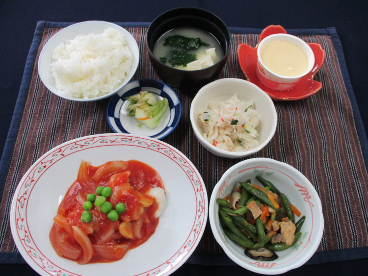 ご飯、ほうれん草と豆腐のみそ汁、たらのトマトソース煮、いんげんと鶏肉の炒め物、大根とカニカマのドレッシング和え、キャベツ漬、プリン