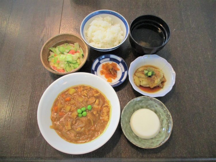 ご飯、わかめスープ、ポークカレー、焼きなす、レタスのサラダ、福神漬け、杏仁豆腐