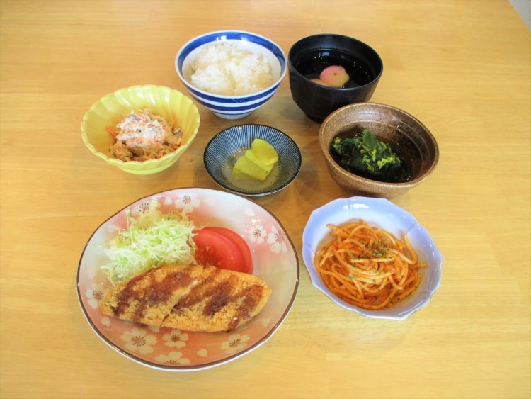 ご飯、花麩の清汁、白身魚フライ、ナポリタン、舞茸の白和え、ほうれん草のお浸し、