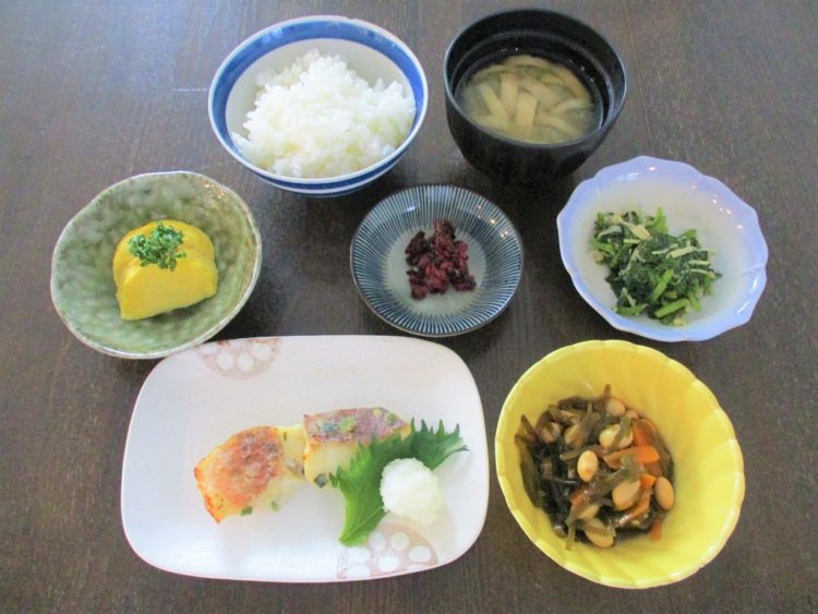 ご飯、板麩のみそ汁、メバルねぎ味噌焼き、五目大豆煮、プチ丸、春菊のごま和え、しば漬け
