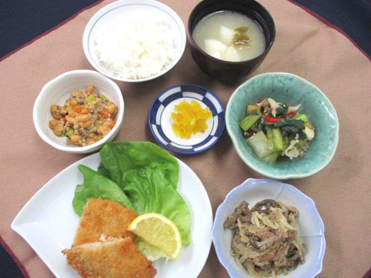 ご飯、かぶととろろ昆布のみそ汁、鮭フライ、チンゲン菜と生揚げの炒め煮、鶏五目豆、