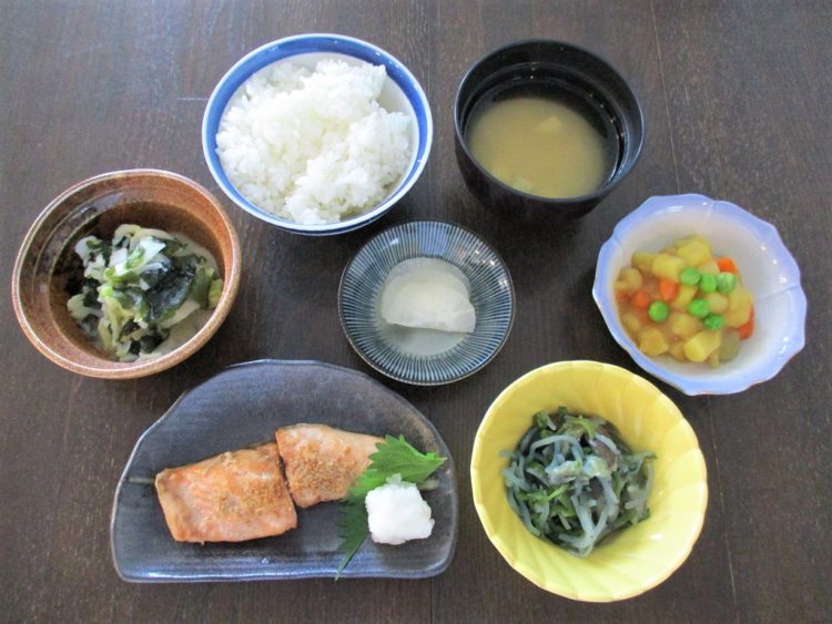 ご飯、豆腐のみそ汁、鮭の利休焼き、なすの炒め物、練りこみ、わかめといかの酢味噌和え、