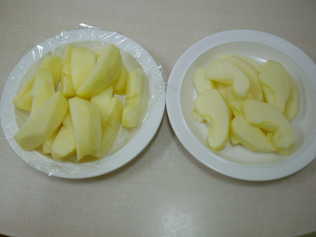 左が職員がカットしたリンゴ、右がたまたま掃除をしていた清掃員さんがカットしたリンゴです。いやぁ、やはりベテランは違いますね...