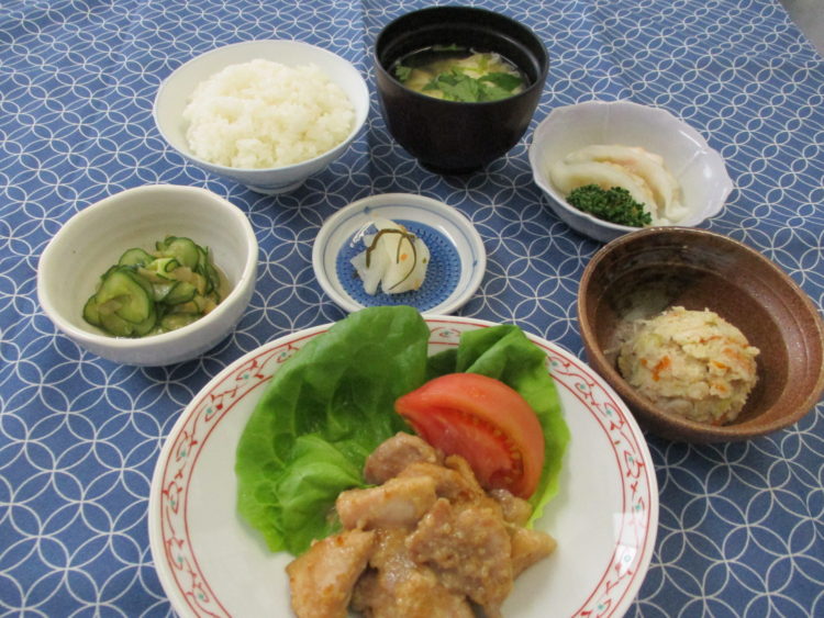 ご飯、かきたま汁、鶏肉のピーナツ焼き、卯の花とあさりの炒り煮、えび餃子、胡瓜とくらげの中華和え、なた割漬