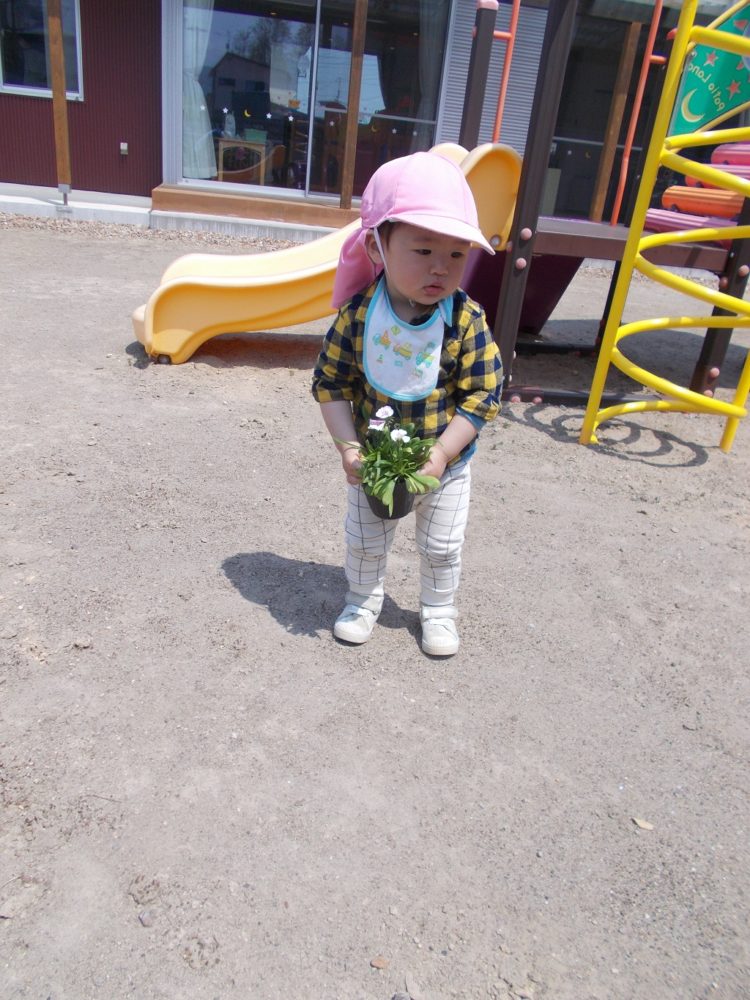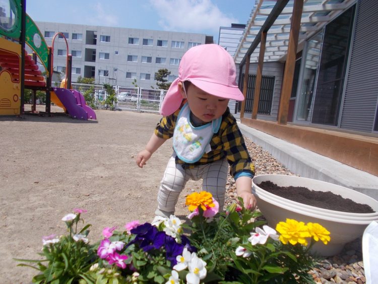 山崎保育園では毎年、子ども達と一緒に野菜や花を植えています。今日はお花が届いたので、うさぎ組のH君と一緒にプランターに花を植えました。ベコニアやペチュニア、いろいろな色の花を見て興味津々になっているH君です。