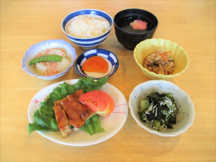 ご飯、オクラの清汁、タンドリーチキン、切干大根の炒め煮、かぶのあんかけ、胡瓜の和え物、